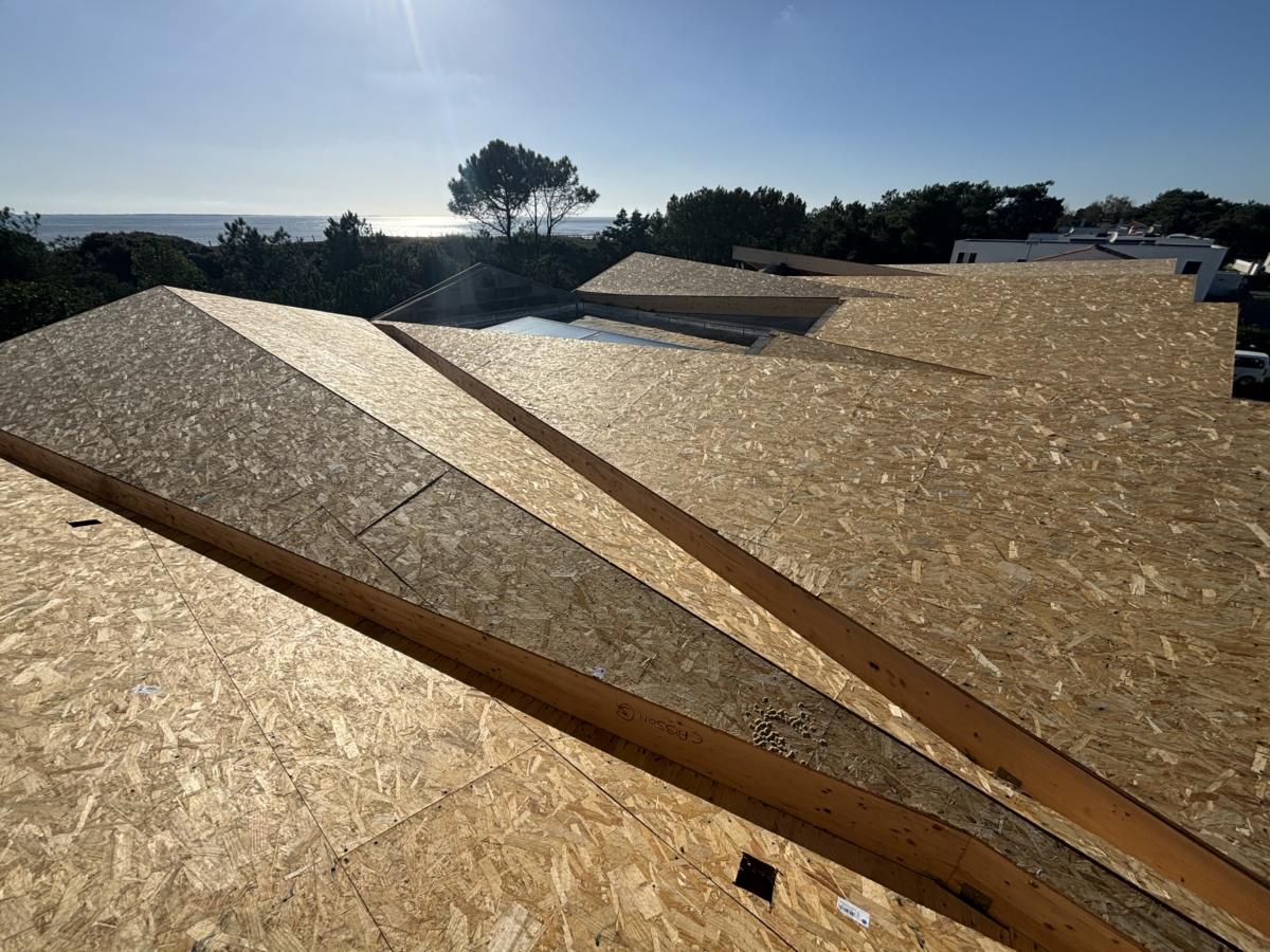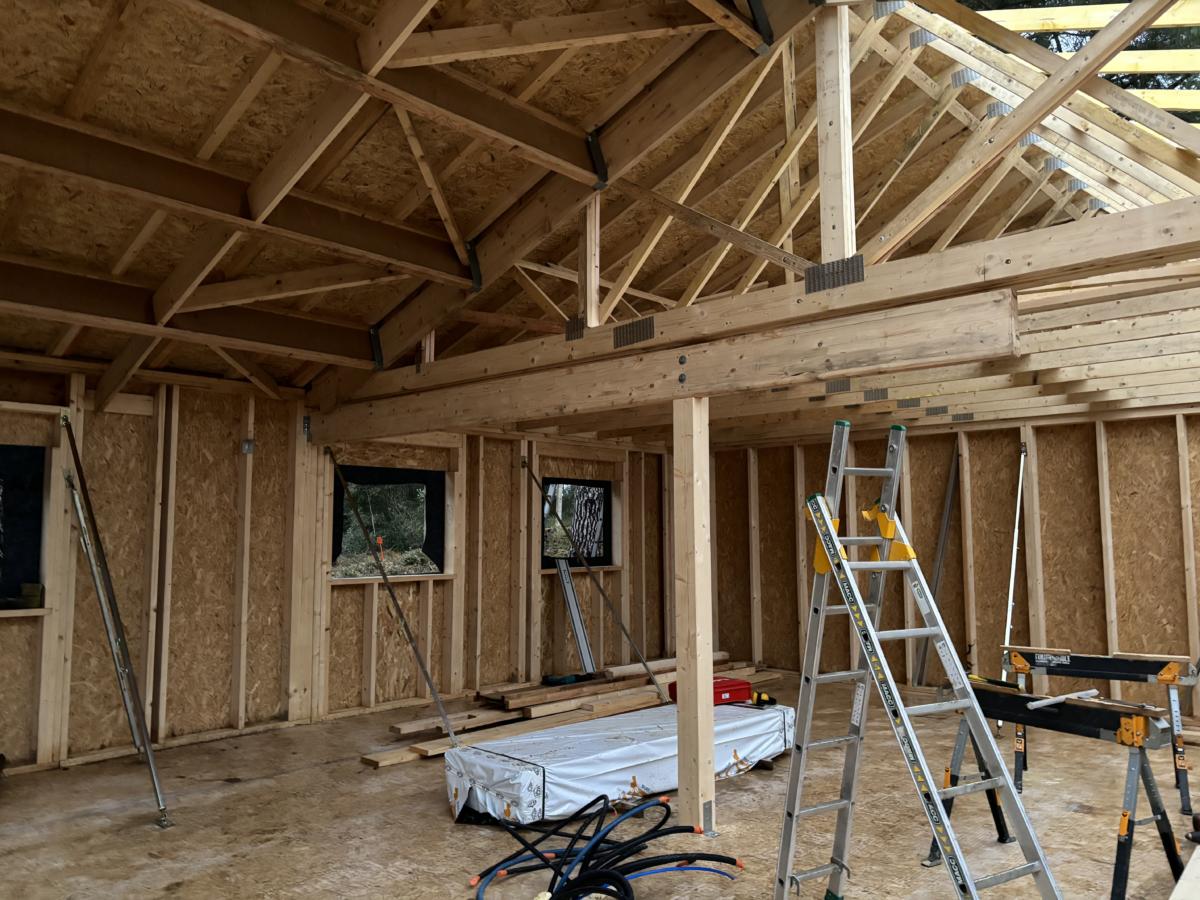 Charpentes traditionnelles en bois massif, lamellé-collé, Lamibois ou poutre en I TRICA (ferme apparente, arêtier-noue, plancher avec assemblages en queue d’aronde, toit plat)
